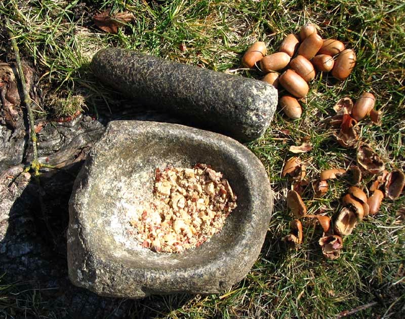 Interesting article. You posed the question why acorns haven't been found in early European cultures. This is because the European oak species are different from the US oak species. The level of tannins in the acorns are much, much higher than the US acorns. This means that to remove the tannins you have to put the acorns through a very long process before they are anyway near edible. It just wasn't worth it. We left acorns for the pigs which would be left to forage in the woods over winter then we ate the pigs. Much easier. Also, the cup marks found in neolithic burial sites such as Cornish Quoits and some Scottish stones are thought to be "energy line re-directors" rather than quern stones.