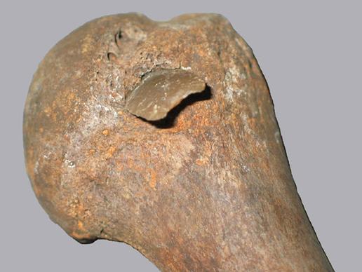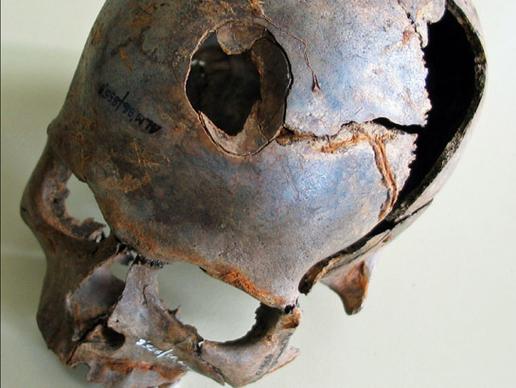 As well as the humerus (upper arm) bone with the embedded flint arrow head, archaeologists have found other proofs that other people have also died in the same area of the violent death. Many bones discovered at the site contain lesions which were produced by blows and many were broken. A scull was found with a bronze arrowhead found firmly embedded into it, penetrating the scull and entering the brain.